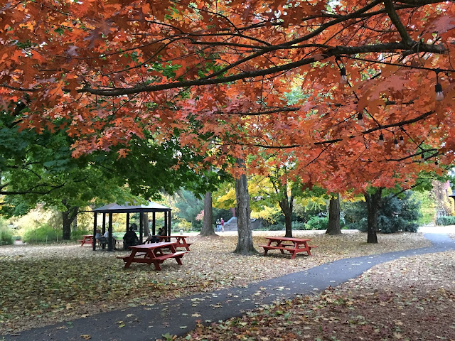 Tuesday, Gail and I flew up to Portland to meet up with my sister Sarah from Anchorage, my sister Berta and her husband Paul from Sligo, Ireland, my brother Steve's widow Lorie and her fiance Brian from Oregon, and my son Nick from Napa. We all stayed at McMenamins Edgefield outside of Portland. It was a great pick for hanging around and enjoying the grounds with its amazing gardens and fall colors. The building, the county poor house at one time, is restored and full of art reflecting the history of its past residents. There are also several pubs, restaurants, a brewery, a winery, golf course, picnic areas, and more.