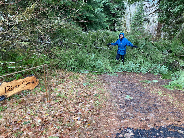 The wind was strong enough to snap the Douglas fir that fell on the driveway. We cut an escape route, as our cars were blocked in. Always keep your chainsaw ready in Oregon!